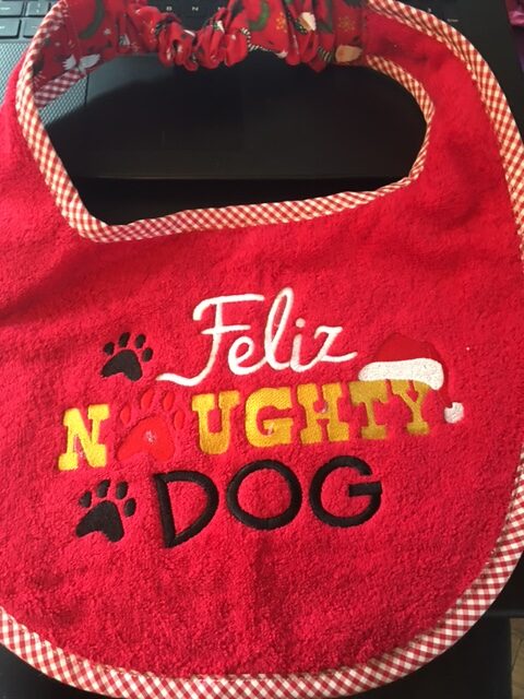 Adult Bib in red with slogan “Feliz Naughty Dog”