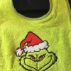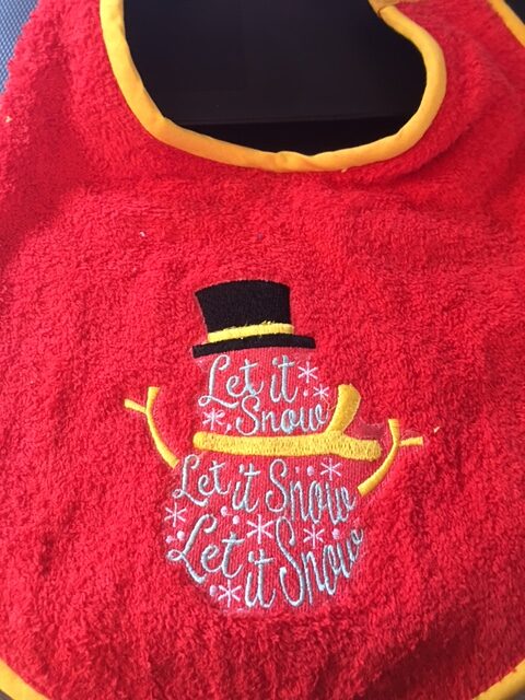 Adult Bib in Red with yellow gold trim and “Let it Snow” snowman