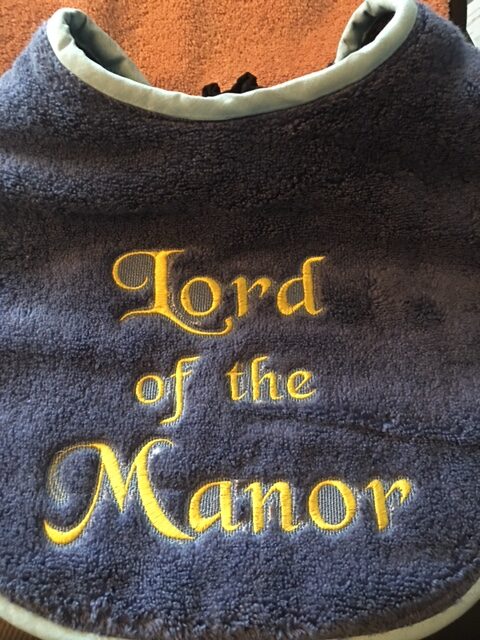 Adult bibs, 1 of each design. Lord of the Manor and Lady of the Manor slogans.