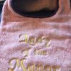 Adult bib in two colours, pink with lilac trim and orange with black trim. Fully washable. Slogan “It’s Newfie-fetti”