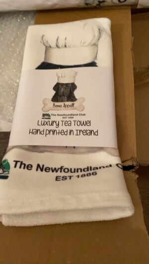 White cotton tea towel with slogan, Black or Brown Newf and chef’s hat