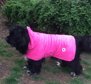 Quality Drying Towelling Robes for Newfs. Dimensions: base of collar to base of tail 88 cm. Machine Washable. Can be washed at 30 degrees, air or cool tumble dry. No bleach. Super thick quality.