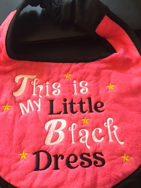 “This is my little Black Dress” slogan. Black glitter Bib. Cotton Back.
