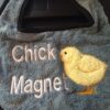 Turquoise adult bib with slogan “Houston, we have a problem”.